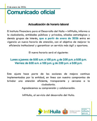 Neiva, enero de 2026. El Instituto Financiero para el Desarrollo del Huila – InfiHuila, informa a la ciudadanía y a ...